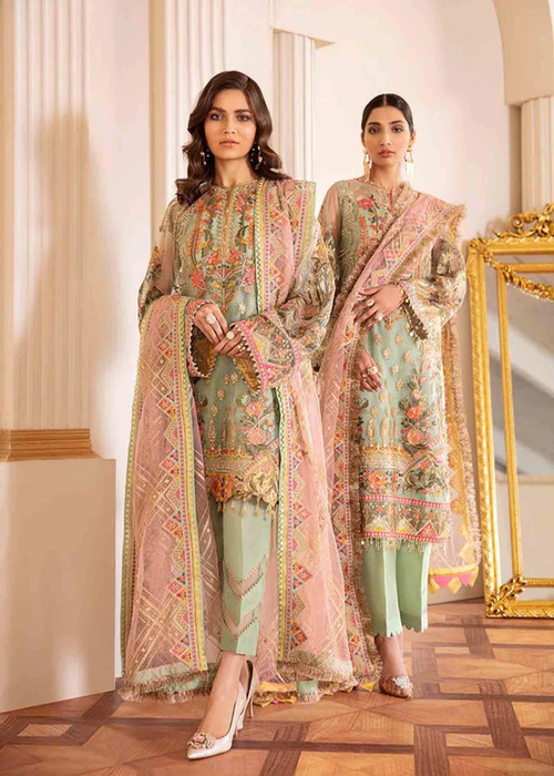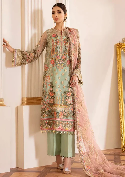 Additional Description: An exquisite 3-piece net ensemble emblazoned with the enchanting fusion of comely hues over the canvas of elegant light green color. The front, back and sleeves are adorned with artistically crafted embroidery. Florets all over the dress ordain an ethereal vista. The net dupatta is embellished with an eloquent embroidered pattern and a swath border. It comes with sophisticated dyed silk trouser.