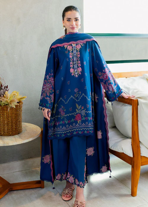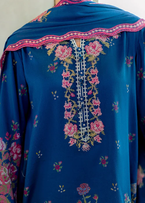 Additional Description: UNSTITCH 3PC: 100% COTTON SATIN DIGITAL PRINTED SHIRT,1 EMBROIDERED NECKLINE. 40 EMBROIDERED PATTI FOR HEM,CAMBRIC DYED TROUSER AND STAPLE WOOLEN EMBROIDERED DUPATTA Shirt 2.5m, Trouser 2m, Dupatta 2.5m.