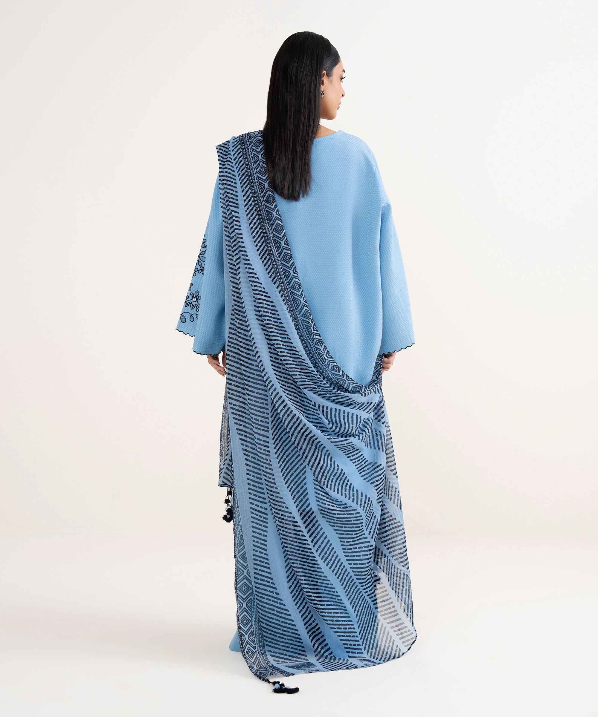 Make a statement with our three-piece embroidered blue ensemble featuring a dobby shirt paired with a blended chiffon dupatta and cotton trousers.